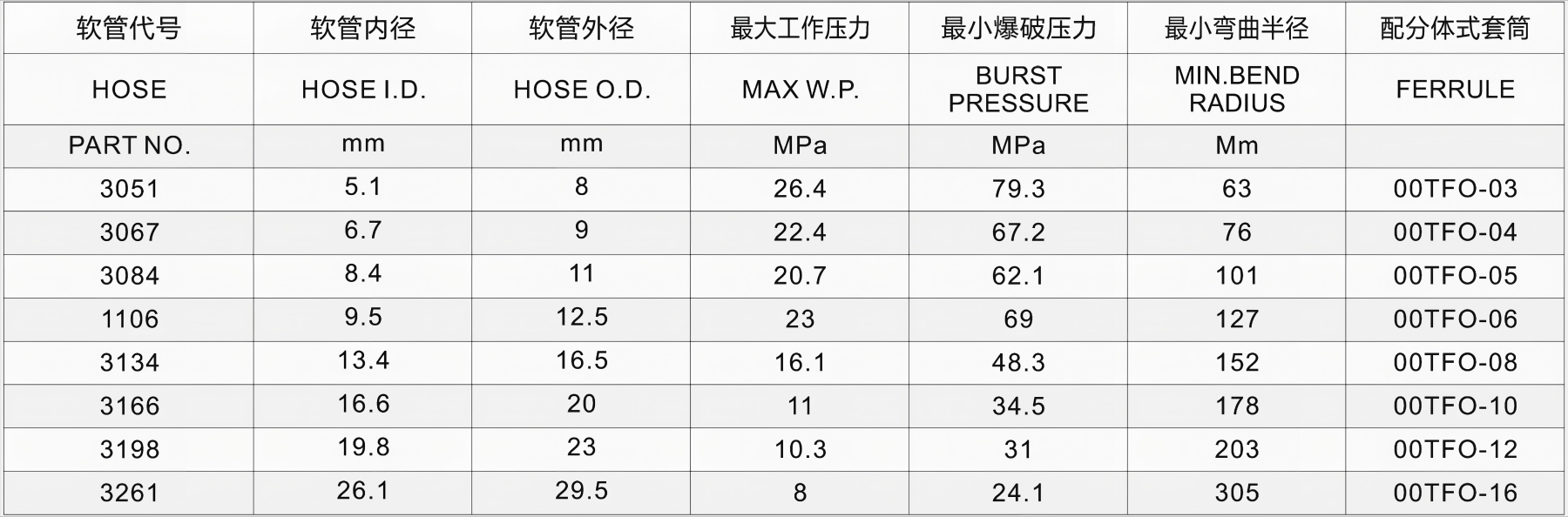 内衬层Inner Tube:铁氟龙 PTFE外覆层Cover:1层304不锈钢丝编织层 One Single Braid Of304 Stainless Steel温度范围Temperature Range:-54℃~+204℃可用分体式接头芯Insert:xxxx1-xx-xx系列/Series