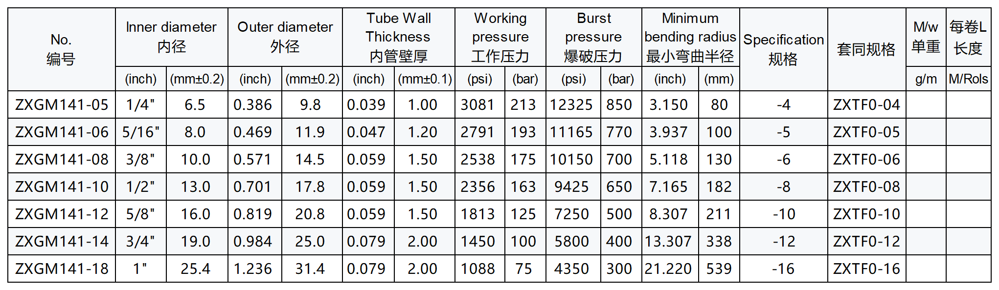 注:标准编号是白色内管加304钢丝编织,编号后加"-A"是半透明内管(改性料)编织,编号后加"-SS"是316钢丝编织, 编号后加"-A-SS"是半透内管(改性料)加316钢丝编织,如:ZXGM141-06-A, ZXGM141-06-SS, ZXGM141-06-A-SS,编号后面加内径尺寸表示内径非标。