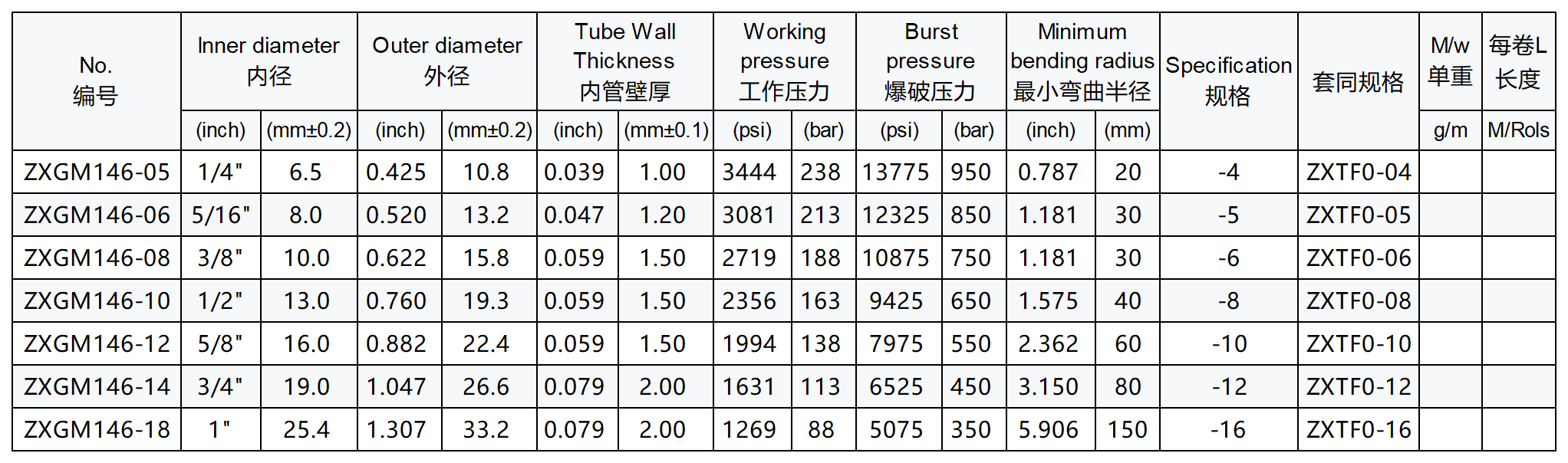 注:标准编号是白色内管加304钢丝编织,编号后加"-A"是半透明内管(改性料)编织,编号后加"-SS"是316钢丝编织, 编号后加"-A-SS"是半透内管(改性料)加316钢丝编织,如:ZXGM141-06-A, ZXGM141-06-SS, ZXGM141-06-A-SS,编号后面加内径尺寸表示内径非标。