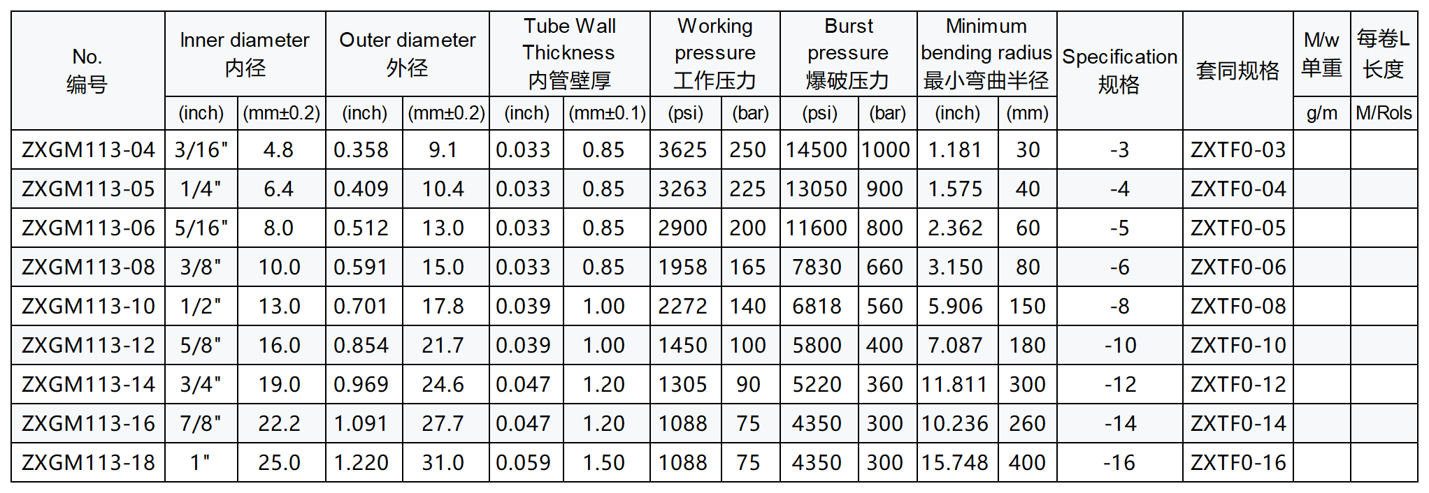 注:标准编号是白色内管加304钢丝编织,编号后加"-A"是半透明内管(改性料)编织,编号后加"-SS"是316钢丝编织, 编号后加"-A-SS"是半透内管(改性料)加316钢丝编织,如:ZXGM112-06-A, ZXGM112-06-SS, ZXGM112-06-A-SS,编号后面加内径尺寸表示内径非标。