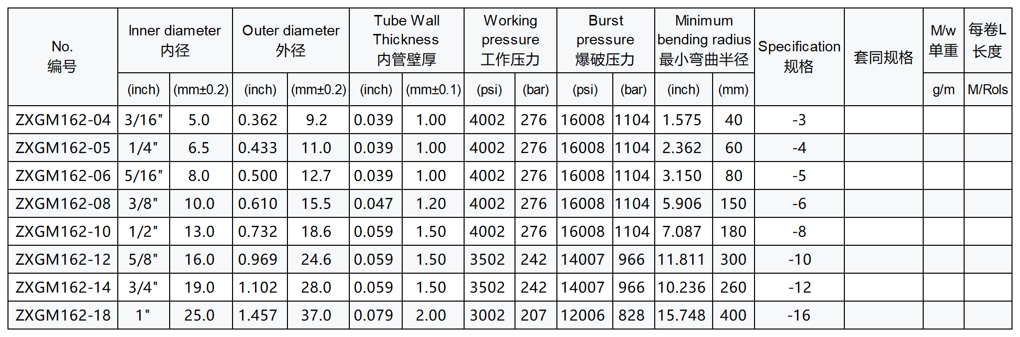注:标准编号是内黑外蓝内管加304钢丝编织,编号后加"-SS"是316钢丝编织, 如:ZXGM162-03-SS, 编号后面加内径尺寸表示内径非标。