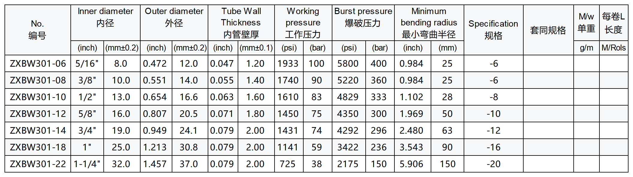 注:标准编号是半透明内管(改性料)加304钢丝编织,编号后加"-SS"是316钢丝编织,如:ZXBW301-06-SS,编号后面加内径尺寸表示内径非标。