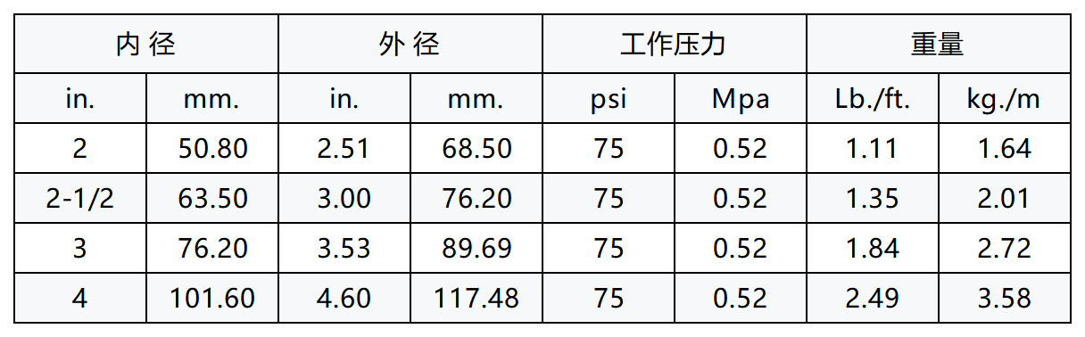 结构:内胶:黑色的,STF(SuperThermo-Flo)的三元乙丙橡胶。外胶:黑色的,耐热的,STF(SuperThermo-Flo)的三元乙丙橡胶(环裹压印)。增强层:带有2层金属螺旋线的人造织物的缠绕层。