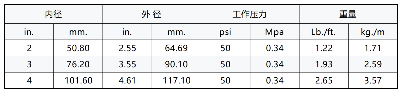 结构:内胶:黑色的,耐热三元乙丙橡胶。外胶:带有橙色螺旋条纹的黑色三元乙丙橡胶(环裹压印)。增强层:带有金属螺旋线的人造织物的缠绕层。