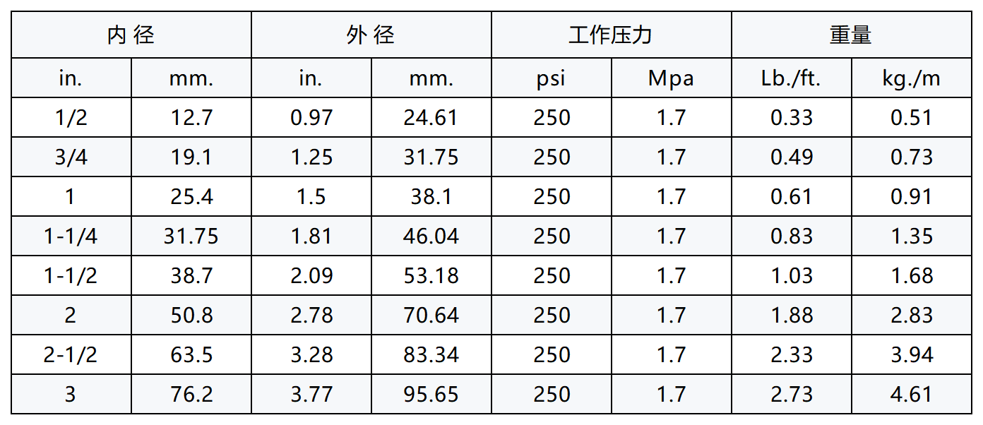 结构:内胶:黑色的三元乙丙橡胶。外胶:黑色的三元乙丙合成橡胶外层,也可以见到带黄色商标的红色的三元乙丙合成橡胶质外层(包裹压印)。增强层:缠绕的金属编织层。