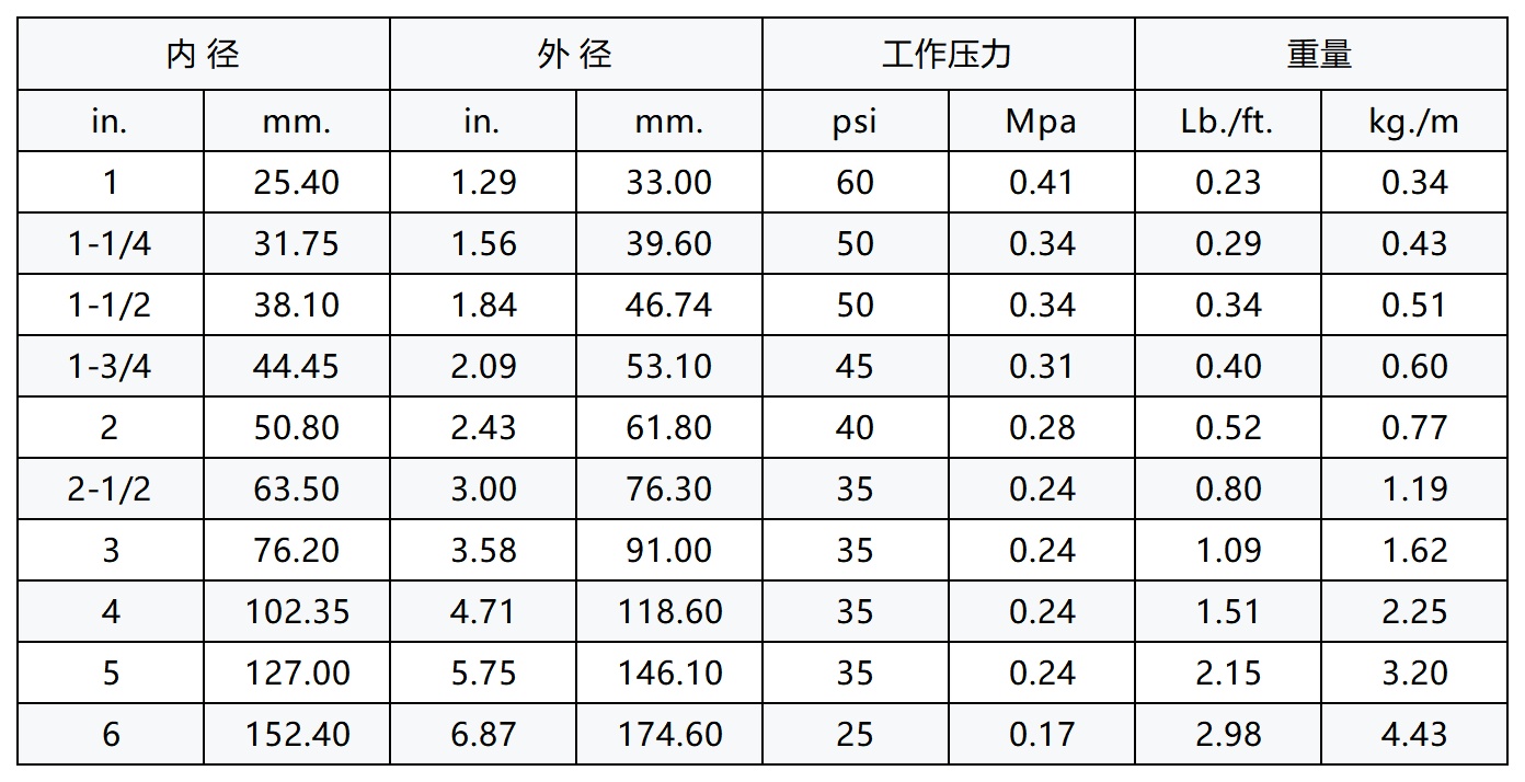 结构:内胶:透明的聚氯乙烯(通过FDA,3-A卫生标准,USDA认证),NSF-61。外胶:透明的聚氯乙烯(波纹状结构)。增强层:带有嵌入式金属丝的透明的高密度聚氯乙烯复合橡胶螺旋层。