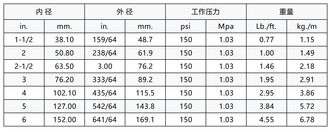 结构:内胶:白色的丁晴橡胶/聚氯乙烯NBR/PVC复合橡胶(符合FDA,USDA,3-A标准)。外胶:灰色的丁晴橡胶/聚氯乙烯NBR/PVC复合橡胶(波纹状,环裹压印而成)。增强层:复合纤维织物层和两层金属线的缠绕层。