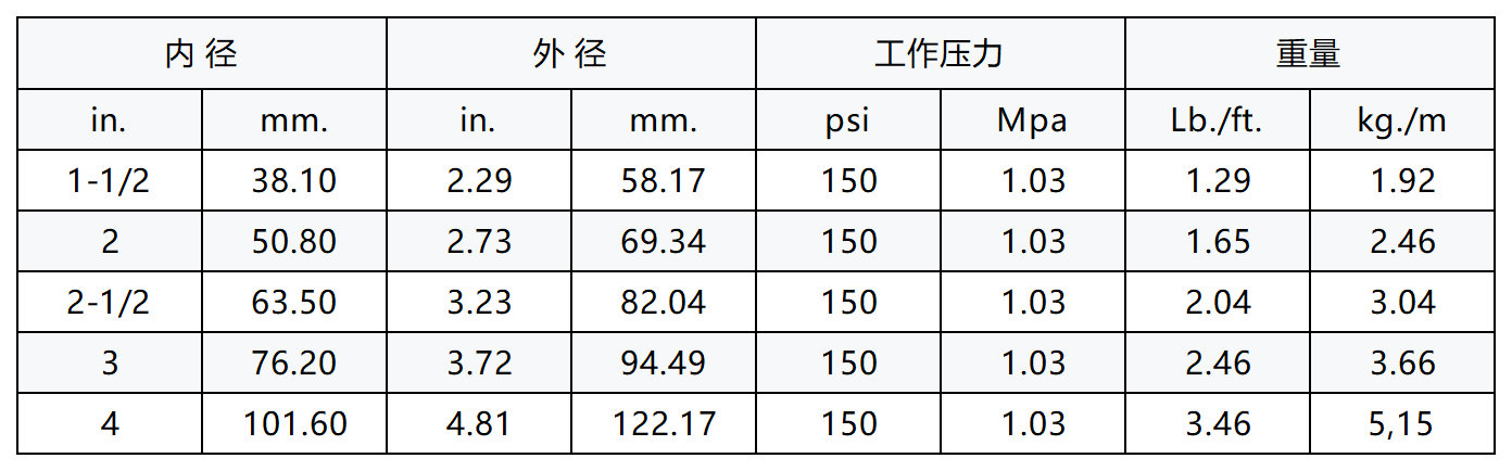 结构:内胶:黑色的丁腈(特殊的耐热性)合成橡胶(耐油)。外胶:带有红色螺旋条纹的黑色氯丁(Wingprene)橡胶(耐油)。增强层:带有金属螺旋线的Flexten螺旋层。