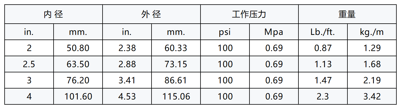 结构:内胶:丁腈橡胶(耐油性)。外胶:带有白色的螺旋条纹的红色氯丁橡胶(耐油),波纹状外形。增强层:带有两层金属线的人造织物的缠绕层。