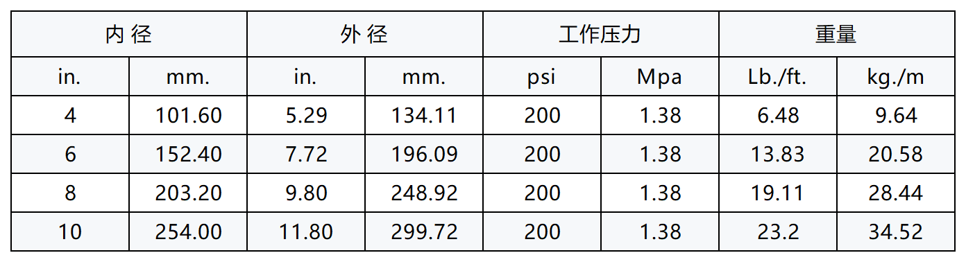 结构:内胶: 丁腈橡胶。外胶: 氯丁橡胶。增强层:带有金属螺旋线的人造织物层。