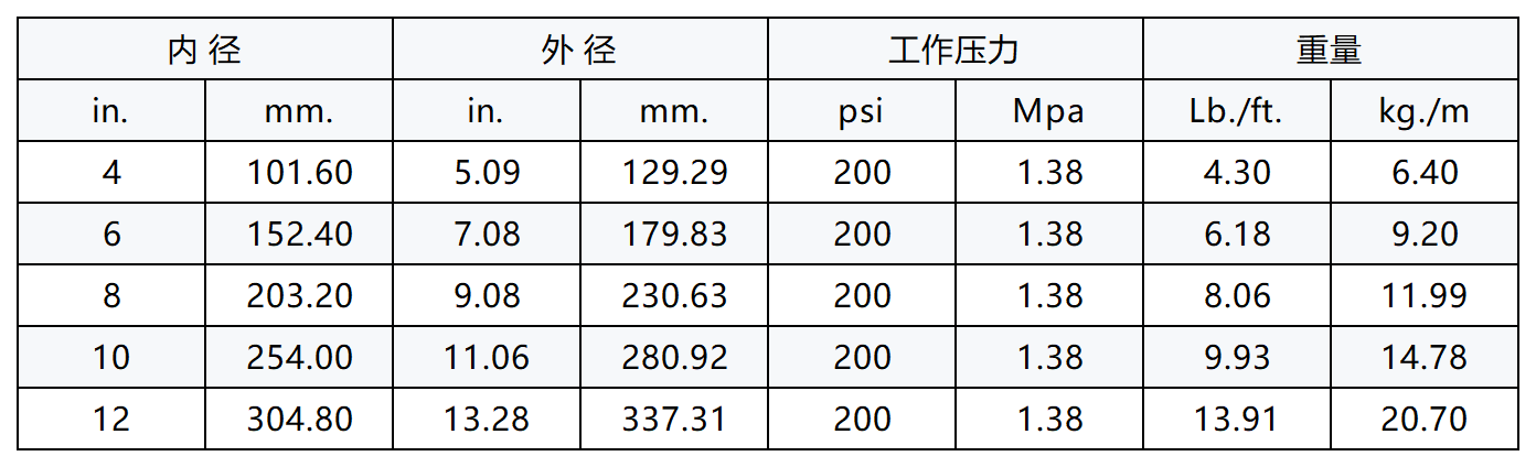 结构:内胶:可输送芳香类成份达50%的石油的丁腈橡胶(Nitrile)内层,或含芳香类物质达100%的石油的氟橡胶Flosyn内层。外胶:黑色的氯丁合成橡胶(Wingprene)。增强层:带有grounding wires的合成纤维螺旋层。