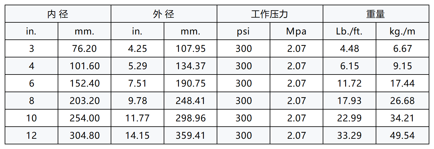 结构:内胶:可输送芳香类成份达50%的石油的丁晴橡胶,或含芳香类物质达100%的石油的氟橡胶。外胶:黑色的波纹状的氯丁橡胶外层(环裹压印而成)。增强层:带有两层金属螺旋线的结实的人造织物的缠绕层。