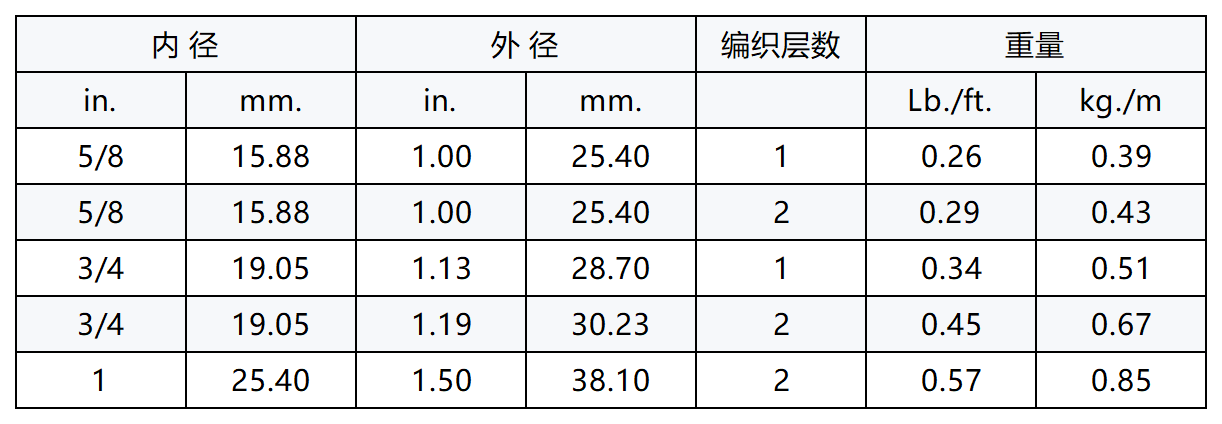 结构:内胶:黑色的丁腈橡胶(ORS)。外胶:黑色的丁腈橡胶/聚氯乙烯合成橡胶(ORS)。增强层:带有纺纱的金属编织层,有一层或两层织物编织加强层。
