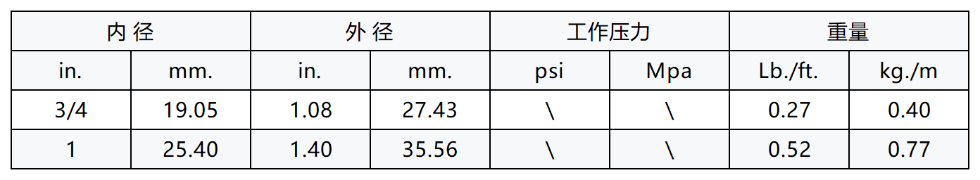 结构:内胶:“丁腈合成橡胶(ORS)。外胶:黑色/红色的丁腈橡胶/聚氯乙烯合成橡胶(ORS)。增强层:纺纱螺旋层(无导电金属线)。