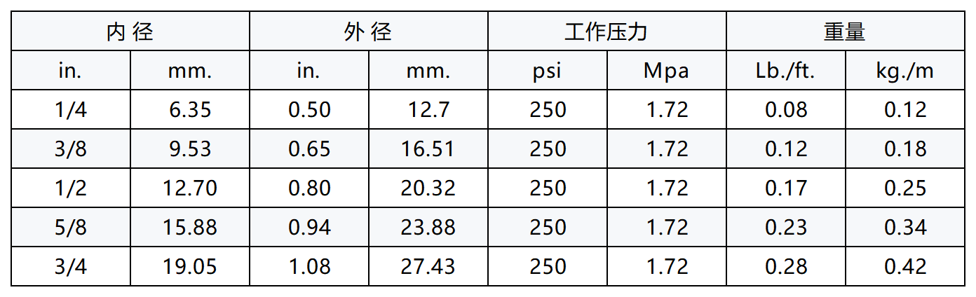 应用:这种软管带有推进式接头在压力为250psi工作是用于低压液压和空气系统中;如工厂空气系统;一般工业,维修业,自动化应用。该管不导电,在1000伏直流电压下,每英寸的最小电阻要高于1兆欧姆。