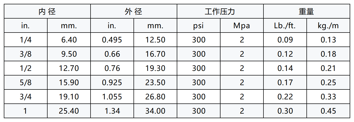 结构:内胶:氯丁二烯橡胶,无缝的,耐高温耐油,RMA的B等级(中级/高级耐油性)。外胶:管有耐候,耐磨和耐油性的羧基丁氰橡胶合成橡胶,RM的A等级(高级耐油性),符合MSHA标准。增强层:高强度纺纱的编织层(1),编织角度对于固定接头有最强的抱紧度。