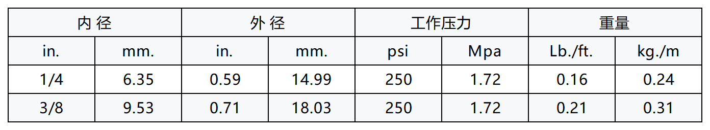 结构:内胶:三元乙丙橡胶,RMA 的C等级(中等耐油性)外胶:三元乙丙橡胶(红色)增强层:合成纺纱螺旋层