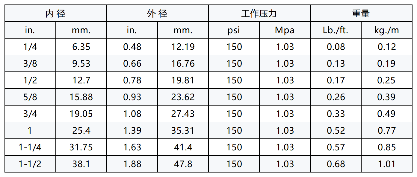结构:内胶:黑色的以三元乙丙为基胶的固特异专利配方的合成橡胶VERSIGARD,具有中等耐油性。外胶:红色或黑色的VERSIGARD®。增强层:合成纤维缠绕层。